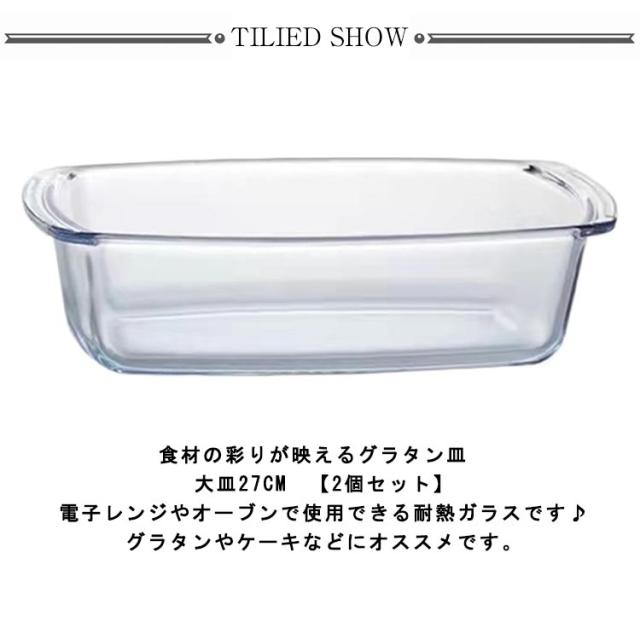 | 食材の彩りが映えるグラタン皿 大皿27cm 【2個セット】 電子レンジやオーブンで使用できる耐熱ガラスです♪ グラタンやケーキなどにオススメです。 オーブンで焼いたケーキやメイン料理は、クリアなガラスなのでそのままテーブルウェアとしても使えます 表面が滑らかなので、油汚れなども簡単に落ち、お手入れも楽々! ガラス製なので長い期間使っていても焦げ付きや汚れが付かずにきれいに使える 熱々のオーブン料理はもちろん、冷たい料理にも涼やかに合わせられます。 様々なタイプのデザートからメイン料理まで幅広く使える! | |