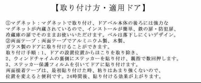 | 【高く澄んだ音色】 澄んだ綺麗な音で、長く鳴いて、良い音は人の心をおだやかな気持ちにさせます。小さな子どもや高齢者のいる家庭にも、部屋から出たことを知らせてくれます。また、玄関だけでなく、リビングや子ども部屋のドアにつけて音色を楽しみます。 【天然原木】 天然木が美しいため、古くから高級家具材や工芸用材として用いられます。 【落ち着いた色合い】 シンプルなスタイルはどんなインテリアにもよく似合います。木目調のデザインで高級感の持ち主としてエレガントさが抜群。 【取り付け方・適用ドア】 1.マグネット:マグネットで取り付け、ドアベル本体の後ろには強力なマグネットが内蔵されているので、インストールが簡単、鉄の扉防犯扉、冷蔵庫の扉でそのままお使いいただけます。ベルは落下しにくいデザイン。 2.両面テープ:両面テープでアルミニウム製、木製、ガラス製のドアに取り付けることができます。 取り付け手順:1、ドアの設置位置からほこりを取り除き、2、ウィンドチャイムの裏側にステッカーを貼り付け、親指で数回押します。3、ステッカー保護フィルムを引いてドアに貼り付けます。両面接着テープは、最初貼り付けた時、粘りはあまり強くないので、位置を変えると便利です。24時間後、貼り付ける効果が上がります。 【用途】ドアベル、インテリアの飾り、風水を改善する装飾 【適用場合】自宅、店舗、ショップ、ホテルの戸・扉 | |