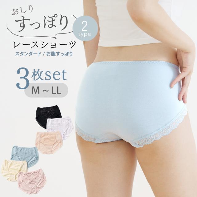 すっぽり レース ショーツ 3枚セット Aset 送料無料 レギュラー 綿混 温活 桃尻 スタンダード レギュラー フロントレース 締め付けない 女性 レディース 年間 M9436T-E