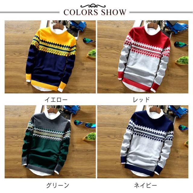 ニット セーター メンズ 長袖 ニットセーター 丸首 クルーネック トップス プルオーバー ノルディック 求心柄 幾何学 セーター スリム 着やせ インナー 防寒 メンズファッション 春服 秋服 冬服 おしゃれ カジュアル M-2XL 4色 送料無料