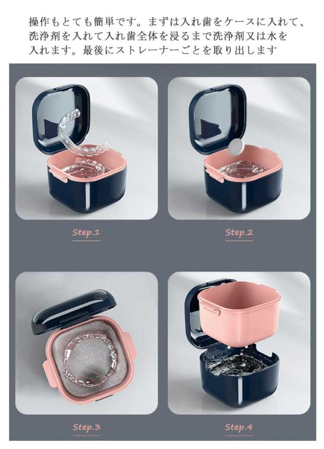 | 人目につく外出時の持ち運びケースとしてもオススメです。どこに置いても違和感なくお使いいただけます。さまざまなデザインのバッグにも合わせやすい まとめて閉まる一体構造。はめ込み式で開け閉め簡単スムーズ!パカッと開いて カチッとしまります!入れ歯の保管も安全安心 洗浄と収納を可能にする二重構造。洗浄後しっかり水切りできるから、つけ置き後はそのまま保管が可能です 取り外し可能なストレーナーが付属し、お手入れが便利です。操作もとても簡単です。まずは入れ歯をケースに入れて、洗浄剤を入れて入れ歯全体を浸るまで洗浄剤又は水を入れます。最後にストレーナーごとを取り出します | |
