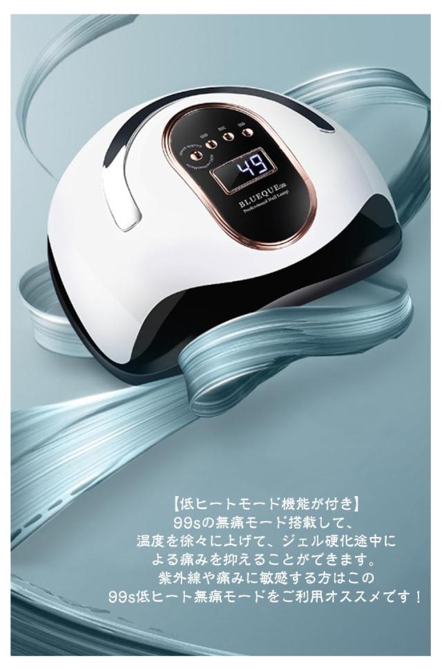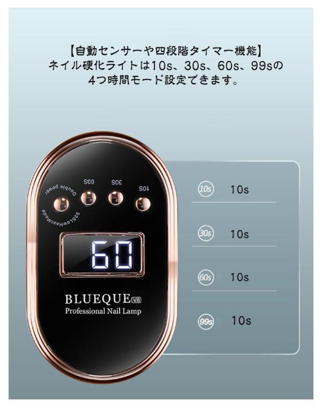 | 【LED & UV ネイルライト】【168W】【4つタイマー設定】 【UV/LED二重光源搭載し&168Wで高速硬化可能】 ジェルネイル用ライトは36枚最速のUVとLEDダブル光源技術を採用。 「ドーム型」180度ムラなく全方位で照射します。 【365〜405nmの照射波長で全ジェル対応】 ほとんどすべてのジェルの硬化範囲に対応しています。 【低ヒートモード機能が付き】 99sの無痛モード搭載して、温度を徐々に上げて、ジェル硬化途中による痛みを抑えることができます。 紫外線や痛みに敏感する方はこの99s低ヒート無痛モードをご利用オススメです! 【自動センサーや四段階タイマー機能】 ネイル硬化ライトは10s、30s、60s、99sの4つ時間モード設定できます。 【取り外し可能な底、指と足にも適用】 ネイルベースは取り外し可能設計を採用され、5本の指の爪或は足の爪を硬化のが簡単になります、清潔も便利です。 | |