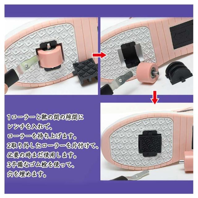 | 22-26cm!大人気のジュニアローラーシューズです。 柔らかい快適な生地。柔軟PU+メッシュ材質採用、通気性が高い、快適なアッパー、シンプルでオシャレなデザインです。 インナーは通気性に富んだファブリック素材で快適な履き心地。 柔らかいTPRソール。ソールは優質なTPR材質で設計され、柔軟性がある。通常のスニーカーモードとローラーモードは自由に変更出来ます。 1ローラーと靴の間の隙間にレンチを入れで、 ローラーを持ち上げます。 2取り外したローラーを片付けて、必要の時まだ使用します。 3予備なゴム栓を使って、穴を埋めます。 1後ろのローラーは安全ボタンで自由に締めます。 2後ろのローラー出して、ローラーシューズになります。 3後ろのローラーを締めて、通常のスニーカーになります。 | |