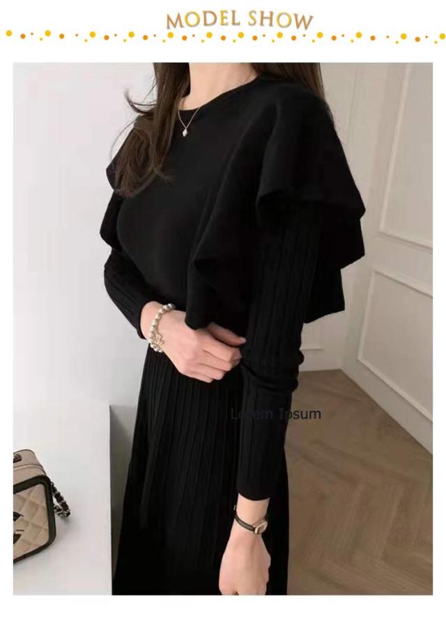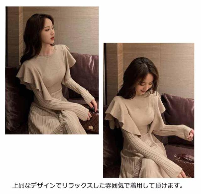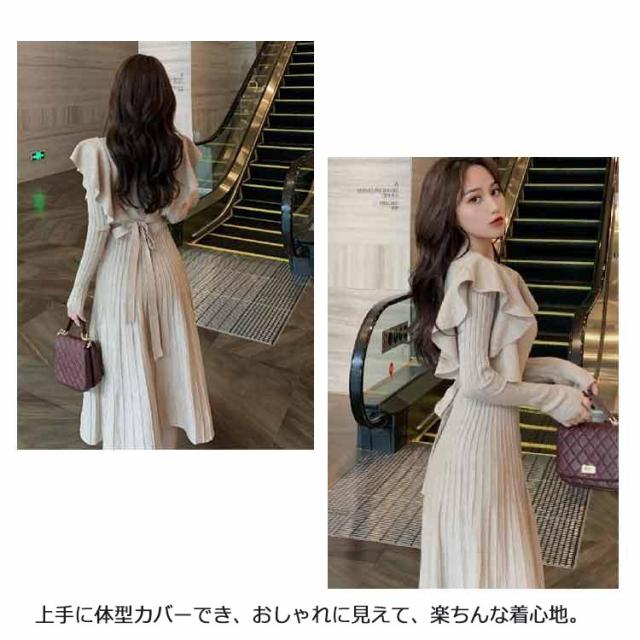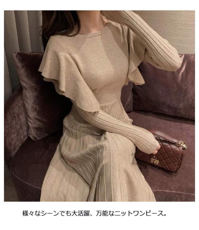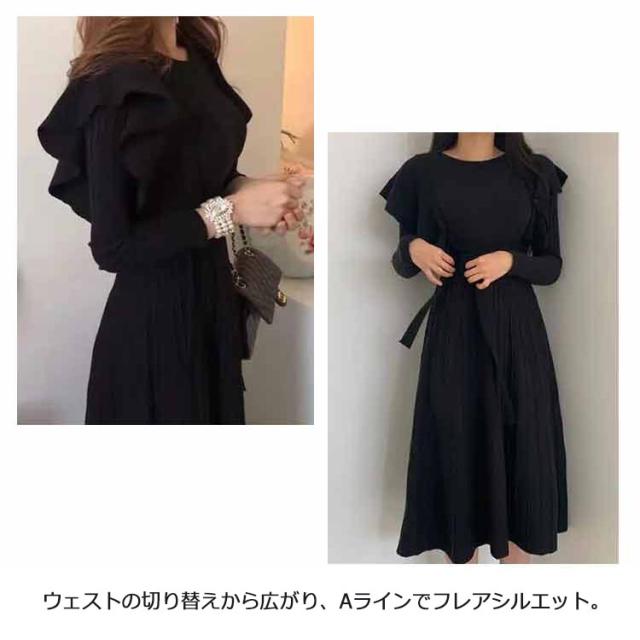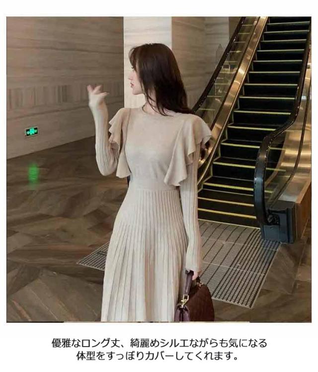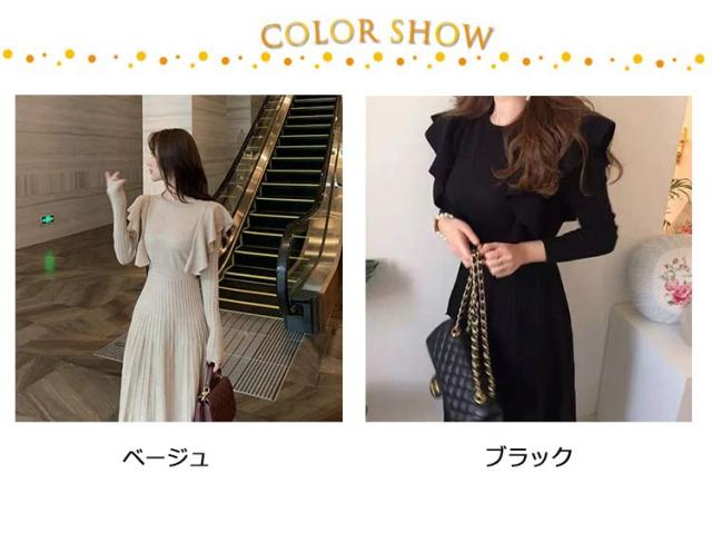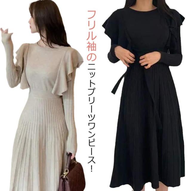 肩フリル ニットワンピース ロング ニット ワンピース ロングワンピース 長袖 プリーツワンピース ひざ下丈 おしゃれ ラウンドネック 春 秋 冬 お呼ばれ オフィス きれいめ シンプル エレガント お呼ばれ ブラック ベージュ S M L XL