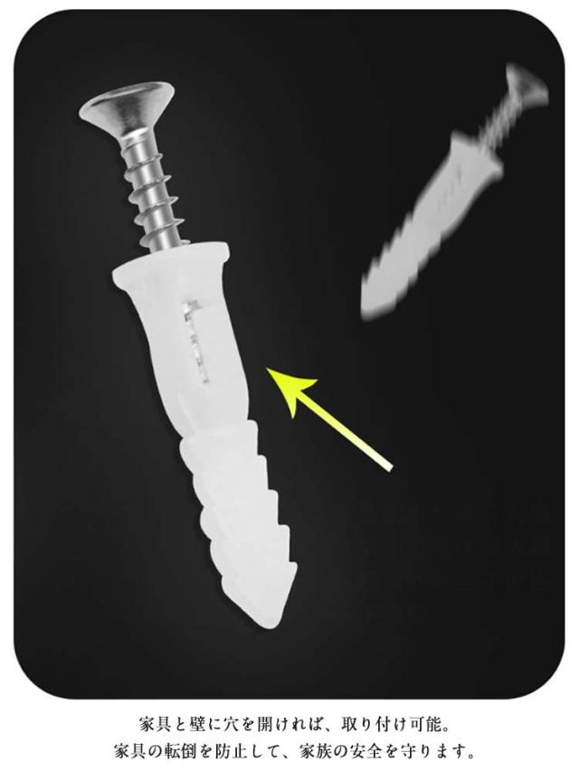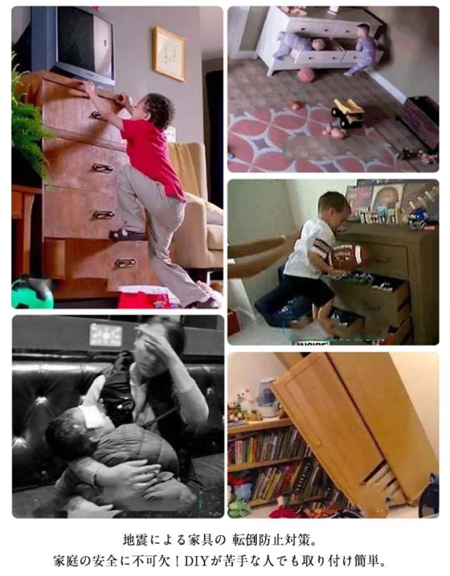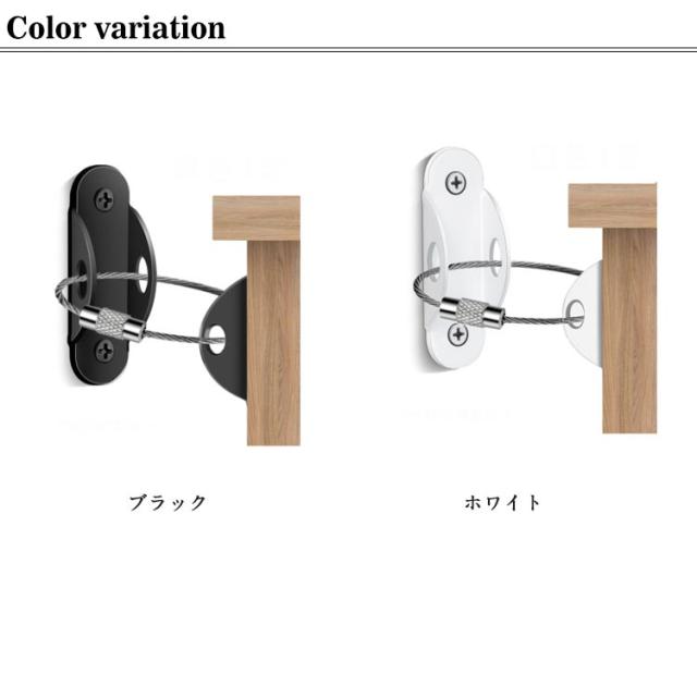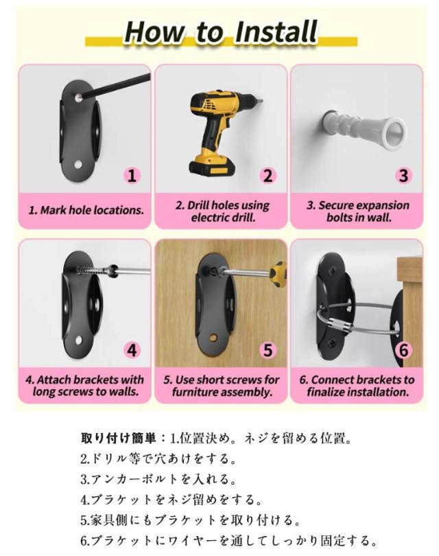 | 【取り付け簡単】地震による家具の 転倒防止対策。家庭の安全に不可欠!DIYが苦手な人でも取り付け簡単。家具と壁に穴を開ければ、取り付け可能。家具の転倒を防止して、家族の安全を守ります。 【使用範囲が幅広い】こちらの金具は大部分の家庭用家具に適しています。本棚スリム、コーナーラック、タンス、突っ張りラック、テレビラック、脚立、大型ラック、食器棚や収納棚など広い場所に使われています。 取り付け簡単:1.位置決め。ネジを留める位置。 2.ドリル等で穴あけをする。 3.アンカーボルトを入れる。 4.ブラケットをネジ留めをする。 5.家具側にもブラケットを取り付ける。 6.ブラケットにワイヤーを通してしっかり固定する。 | |