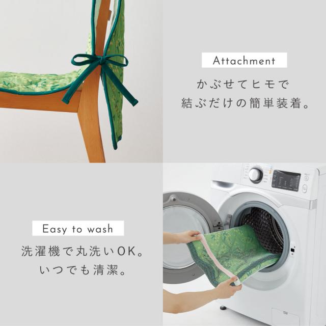 椅子にカバーをかぶせてヒモで結ぶだけの簡単装着。椅子の汚れ防止にも最適です。洗濯機で丸洗いOK。