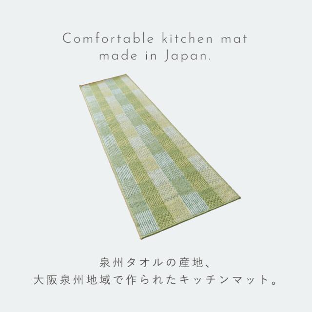 泉州タオルの産地として約130年の歴史と伝統を誇る、大阪泉州地域で生産されたキッチンマット。落ち着いたアップルグリーンのカラーが爽やかな印象。キッチンのインテリアにも合わせやすく、清涼感ある空間にします。