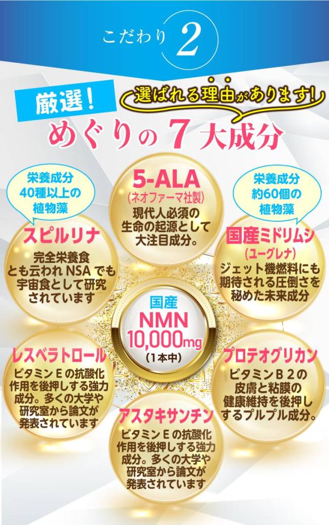 ・原材料:β-ニコチンアミドモノヌクレオチド(NMN)(国内製造)、還元麦芽糖水飴、ナタネ硬化油、デキストリン、赤ブドウ葉抽出物、スピルリナ、22種類乳酸菌プレミックス(マルトデキストリン、乳酸菌末(乳成分・大豆を含)、ラクトース/微結晶セルロース、グリセリン)アスタキサンチン、サケ鼻軟骨抽出物、5ALA、ユーグレナ/結晶セルロース、HPMC、ショ糖エステル、ジェランガム、ビタミンE、ビタミンB2、ビタミンC、アラビアガム、ナイアシン、パントテン酸Ca、ビタミンB1、ビタミンB6、ビタミンA、葉酸、ビタミンB12、ビタミンD