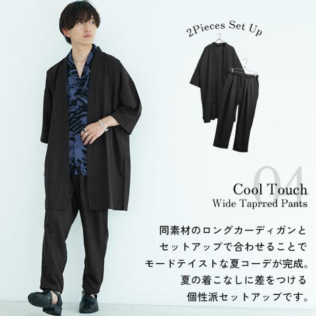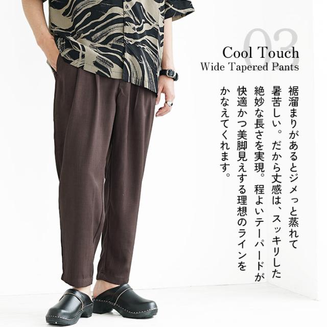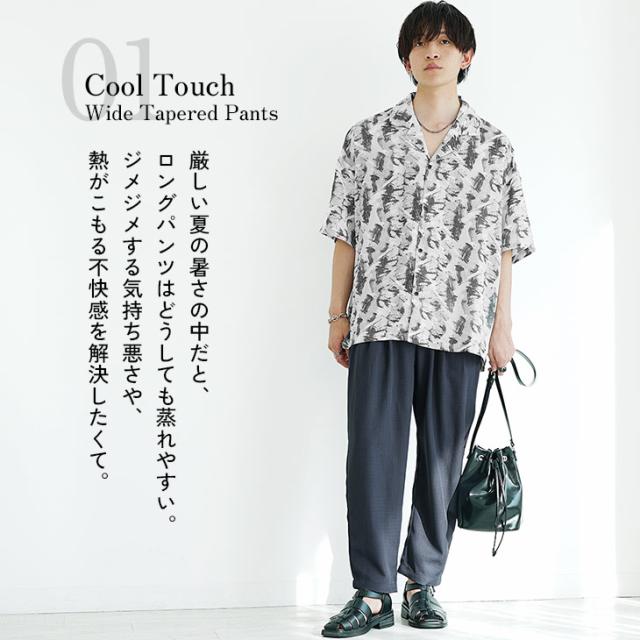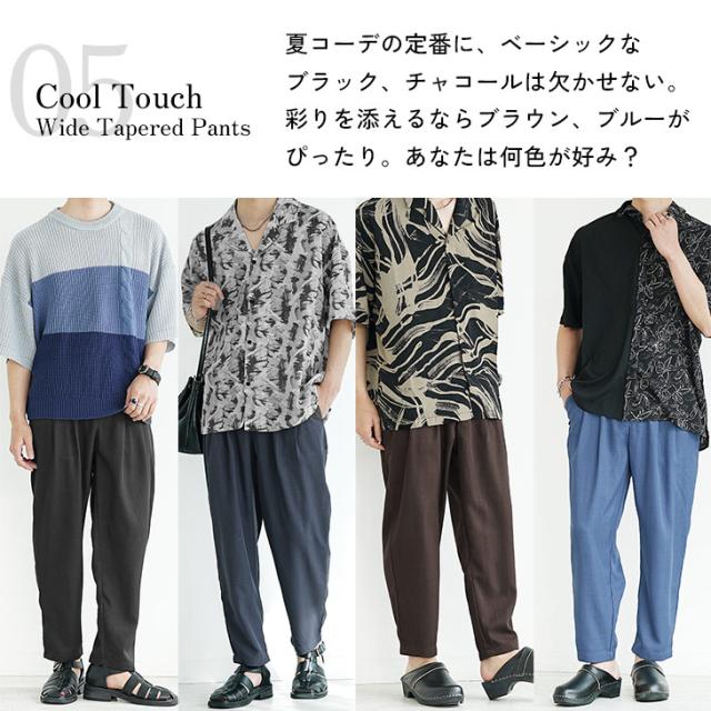 足首に向かってゆるやかに細くなるのが特徴的なテーパードパンツ。すっきりと清潔感のある印象に仕上がります。さらりとした肌ざわりの接触冷感素材が快適な穿き心地を叶えます。