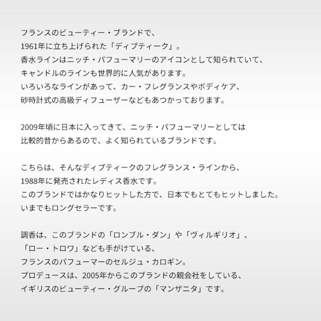 こちらは、そんなディプティークのフレグランス・ラインから、1988年に発売されたレディス香水です。このブランドではかなりヒットした方で、日本でもとてもヒットしました。いまでもロングセラーです。