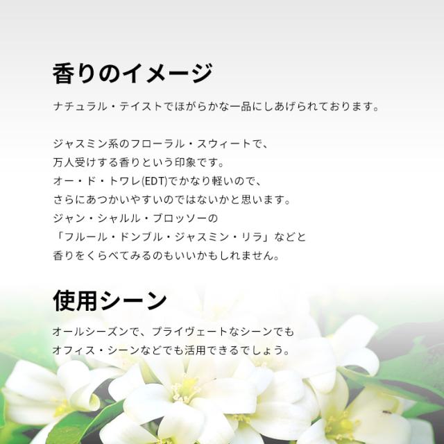 ジャスミン系のフローラル・スウィートで、万人受けする香りという印象です。オー・ド・トワレ(EDT)でかなり軽いので、さらにあつかいやすいのではないかと思います。