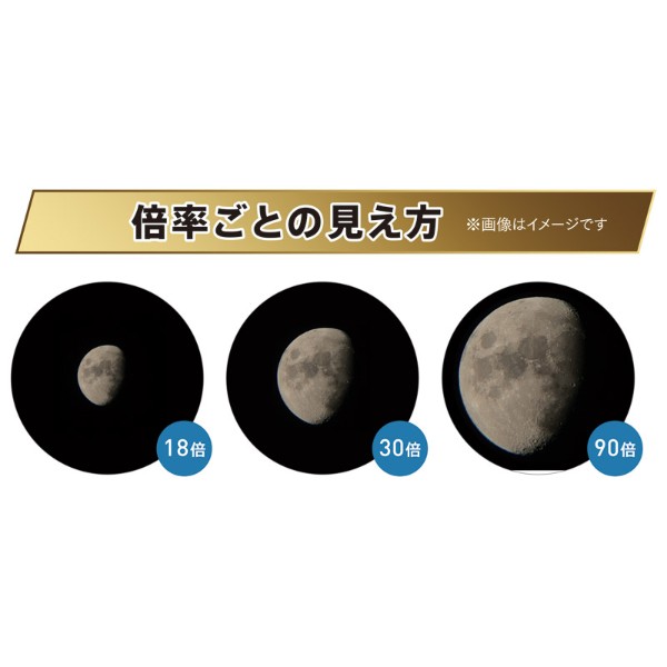アイピースは3個付属しており、倍率を18倍・28.8倍・90倍と変更して楽しめます。