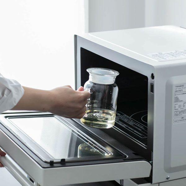 フタをして電子レンジ可能でフタをしたまま注げる形状。