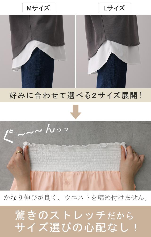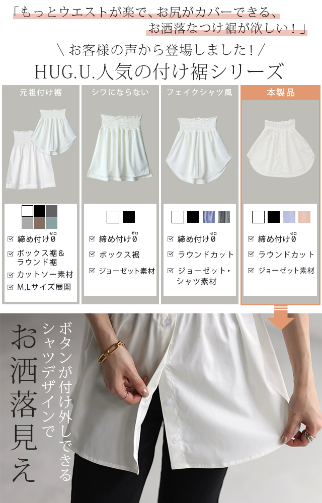 レイヤード つけ裾 付け裾 つけすそ チラ見せ ちら見せ 重ね着 重ね着風 ウエストゴム ウエスト ゴム ゴムウエスト ゴムウェスト ウェスト ゴム 裾 フェイクレイヤード フェイク レイヤード ラウンドカット ラウンド カット ラウンドシルエット ラウンド シルエット シャツ シャツタイプ 冷え防止 冷え性予防 腹巻 はらまき 腹巻き フリーサイズ フリー S M L LL 2L XL 3L XXL LLL ブラック 黒 黒色 ホワイト 白 白色 オフホワイト アイボリー 生成り ライトブルー ブルー 青 青色 水色 ピンク 桃 桃色 綿 コットン 綿混 ポリエステル フェミニン ガーリー 体型カバー 二の腕カバー 二の腕隠し 着痩せ 着回し お尻が隠れる 大きい 大き目 プラスサイズ カジュアル ナチュラル 大人カジュアル レディースファッション ベーシック オフィス オフィスカジュアル テレワーク リモートワーク リモート オンライン飲み会 韓国ファッション 韓国風 韓国 ストリート おうち時間 お家時間 デート お出かけ フェス リゾート ビーチ 海 旅行 飛行機 パーティー パーティ 着回し 母の日 プレゼント ギフト 贈り物 クリスマス シンプル 大人 オトナ 大人カジュアル オフィスカジュアル オフィス レディースファッション 女性 綺麗 綺麗目 きれい キレイ キレイめ キレイメ きれいめ 高見え 上質 上品 ゆる ゆったり 旬 トレンド 20代 30代 40代 50代 60代 おしゃれ お洒落 オシャレ 可愛い かわいい カワイイ カッコいい 格好良い カッコイイ 春 夏 秋 冬 春夏 秋冬 ロングシーズン オールシーズン HUG.U HUGU ハグユー はぐゆー