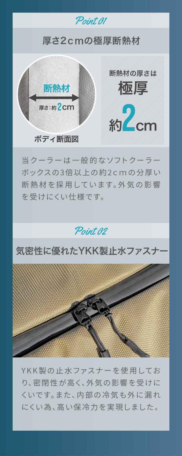 | 特記事項: ※ボックス内にドライアイスを入れないでください。 ※高温多湿や、火の元に近い場所に保管はしないでください。 ※直射日光に長時間当てないでください。変色するおそれがあります。 ※濡れたりよごれたりした場合は、乾いた布で乾拭きし風通しの良い場所で乾燥させてください。 ※濡れたまま長時間放置しないでください。変色・カビの原因となります。 ※完全防水商品ではありませんので、水や氷を直接入れて使用しないでください。 |