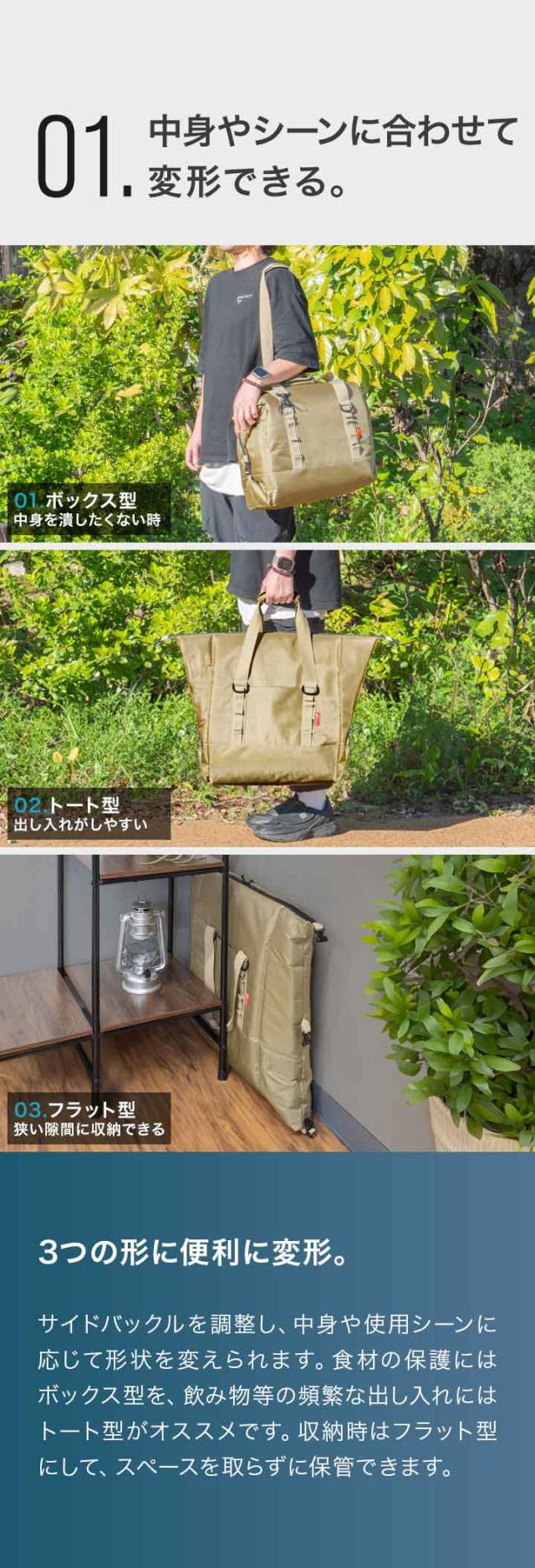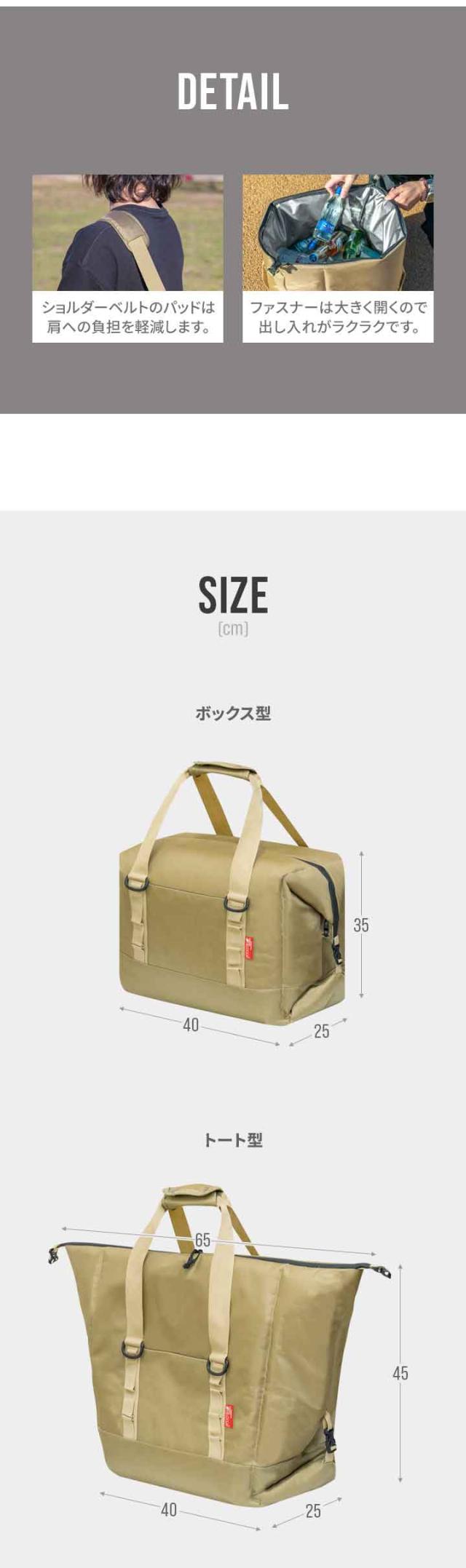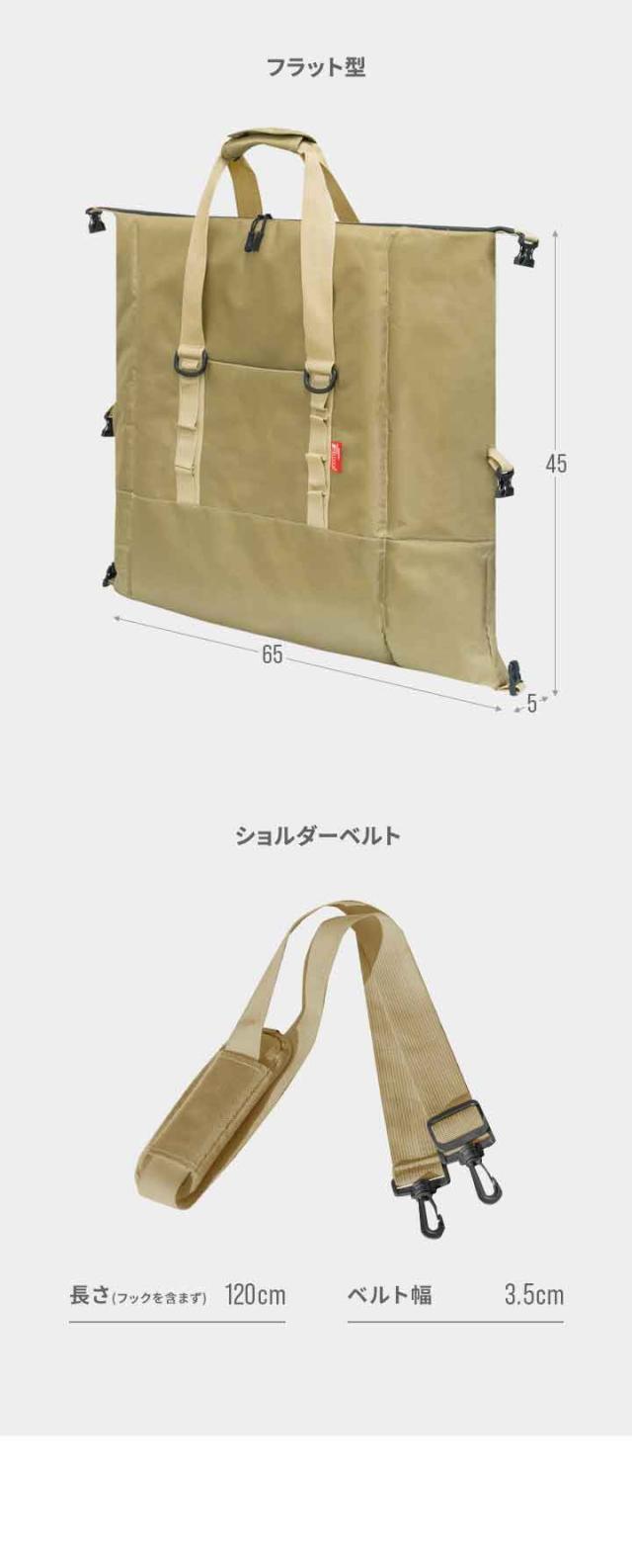 | サイズ: ・ボックス型使用時 :(約)40cm×25cm×35cm ・トート型使用時 :(約)65cm×25cm×45cm ・フラット型使用時 :(約)65cm×5cm×45cm ・ショルダーベルト :(約)3.5cm×120cm |