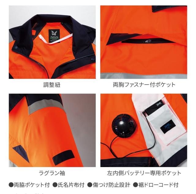 調整紐、両胸ファスナー付ポケット、ラグラン袖、左内側バッテリー専用ポケット、左袖ペン差し付、裾ドローコード付、氏名片布付、ファスナー:樹脂(引手:金属)、ボタン:樹脂