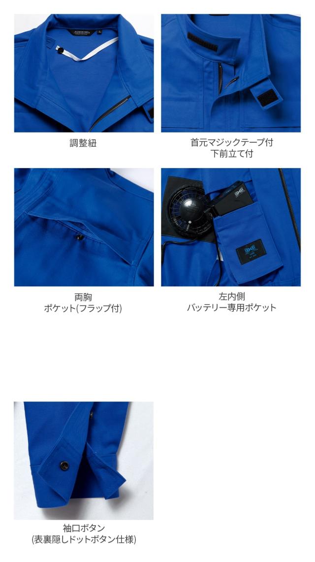 耐熱・耐炎の難燃素材を使用した空調服(R)。暑さの厳しい現場でも涼しく快適! 調整紐、右胸フラップ付ポケット、首元マジックテープ付下前立て付、左内側バッテリー専用ポケット、袖口表裏隠しドットボタン、金属ファスナー、金属ボタン |