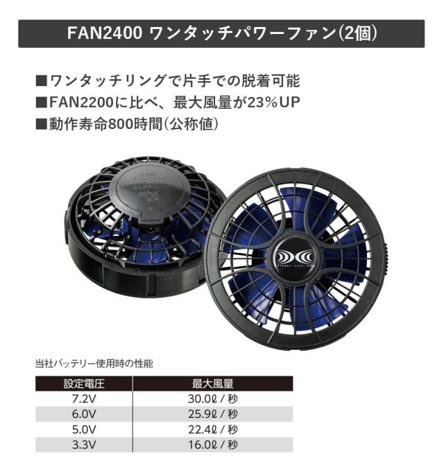 | ファンスペック | FAN2400 【外寸】厚さ53mm(最大値) 【重量】131g 【バッテリー設定電圧:風量】・7.2V:30.0ℓ/秒 ・6.0V:25.9ℓ/秒 ・5.0V:22.4ℓ/秒 ・3.3V:16.0ℓ/秒 |