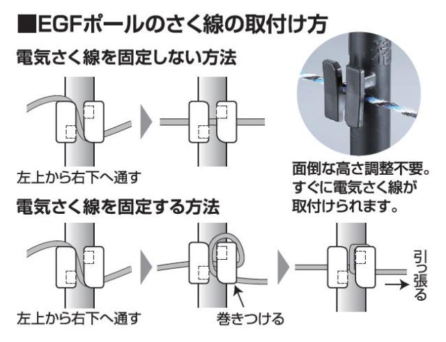 | ・ゲッターEGFポールはリングに合わせて打込むだけで電気さく線の高さをあわせられるガイシと 支柱が一体になった「ガイシ一体型FRPポール」です。 ・ゲッターEGFポールの上部にネジ溝が切られており、ゲッターEGF延長ポールをネジ込みで簡単にポール の長さを延長することが可能です。 |