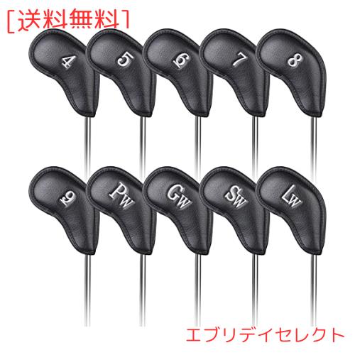 ゴルフアイアンカバー マグネット 10pcs(4-9,PW,GW,SW,LW) ウェッジカバー クラブヘッドカバー セット 合成皮革 ブラック 銀色番号 左右