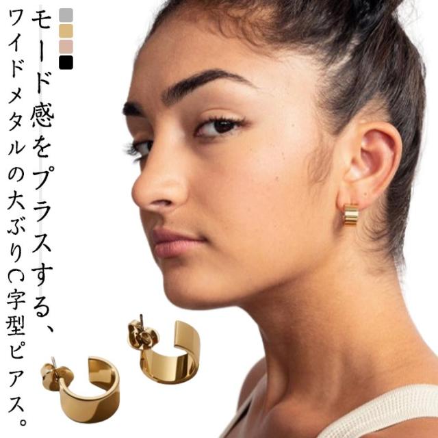 ピアス イヤリング 大ぶり 両耳 ピアスフープ フープ C字型 ワイド メタル ステンレス シンプル オフィス おしゃれ 個性 上品 カジュアル 大人 かわいい ジュエリー シルバー ゴールド ローズゴールド ブラック 黒 4色から選べる キャッチ付き