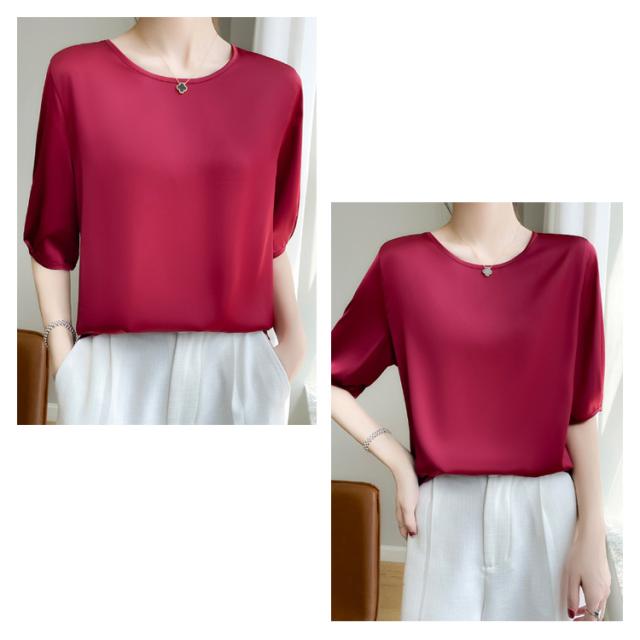 5分袖 トップス シルク レディース ブラウス シャツ 春 夏 半袖 UVカット クルーネック サテン 大きいサイズ シャツブラウス 上品 光沢感 吸湿 保湿 シルクサテン 大人 ツルツル 無地 シンプル 送料無料
