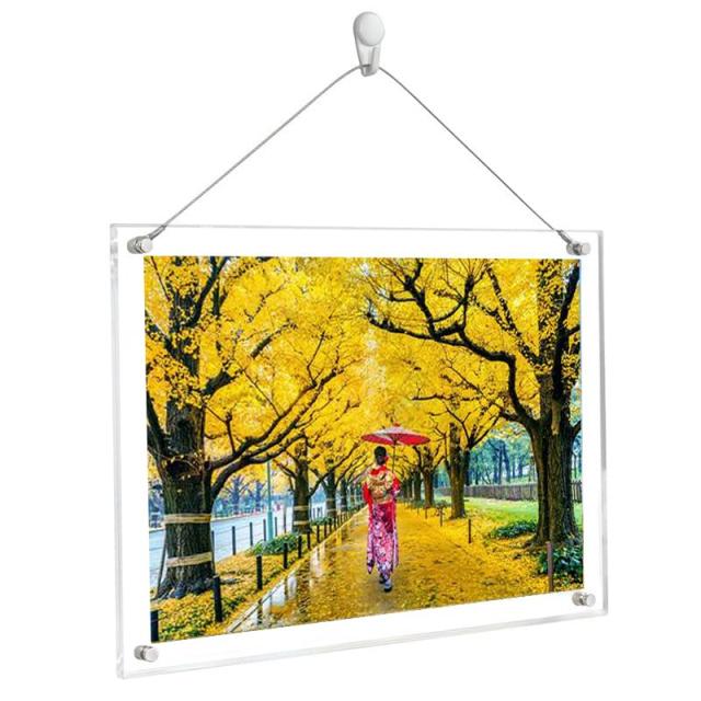 ?【色んな場合にぴったり】アクリル板2枚で写真を挟みこんで飾ります。アクリル板にオスやメスのネジを取り付ければセットアップ完了、縦置きか横置き、フレームを支えてる支柱の位置を変えると置き方が変えられます。ワイヤーをフレームに装着すると壁に掛ける事が出来ます。写真などの交換もカンタン。