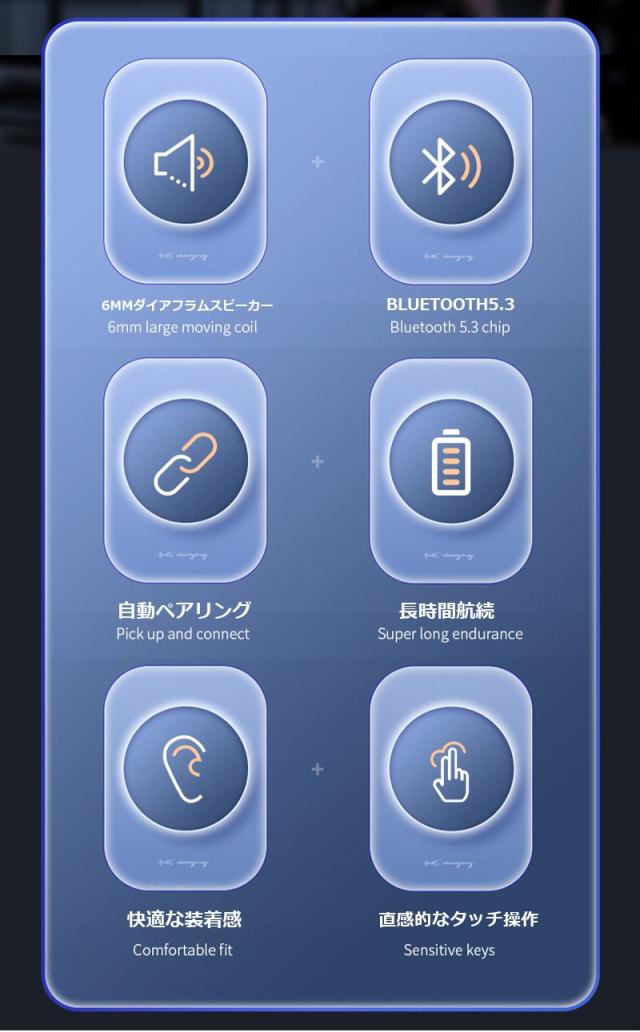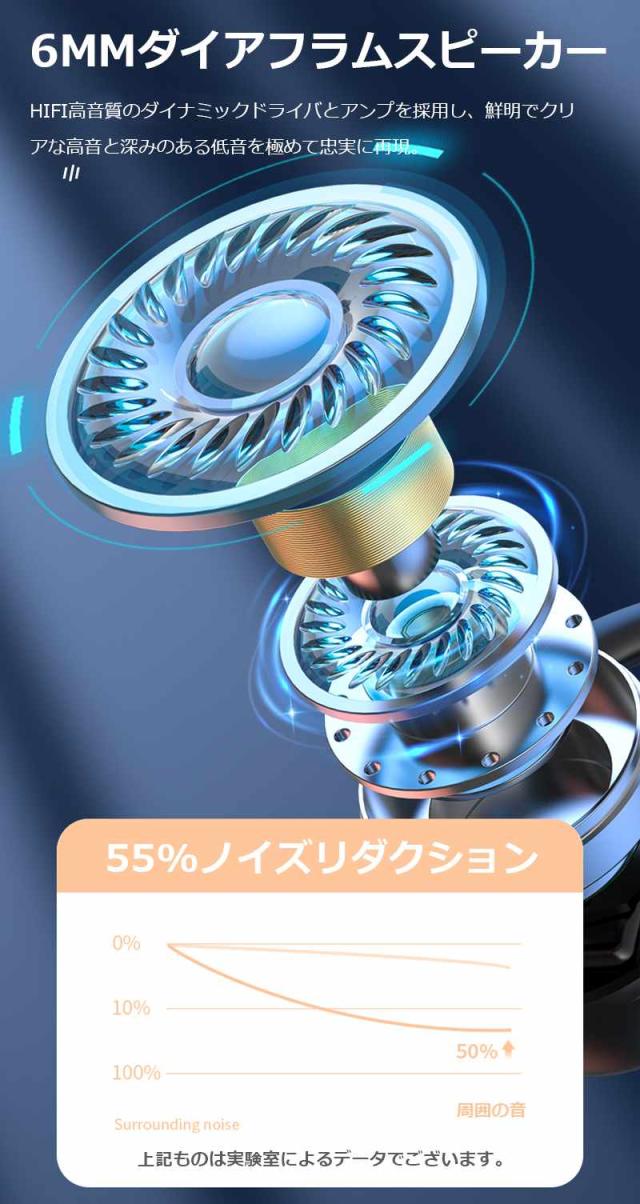 【Bluetooth5.3】左右のイヤホンにBluetooth5.3チップが搭載されており、より高速な伝送速度と安定した通信が実現されました。干渉防止能力も向上させ、音楽鑑賞はもちろん、ゲームや動画もスムーズで思う存分楽しめます。