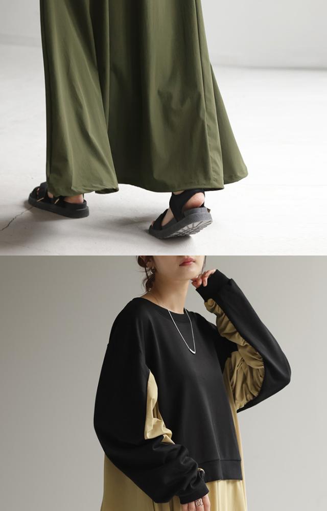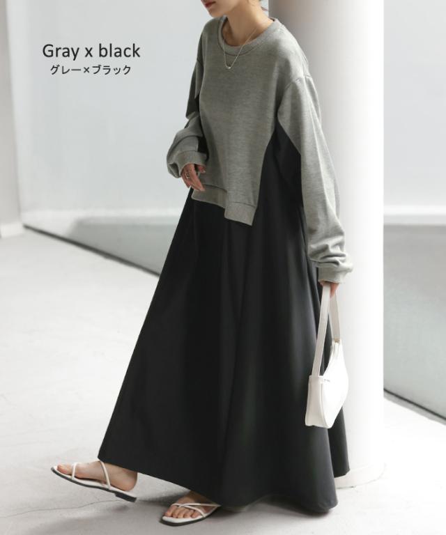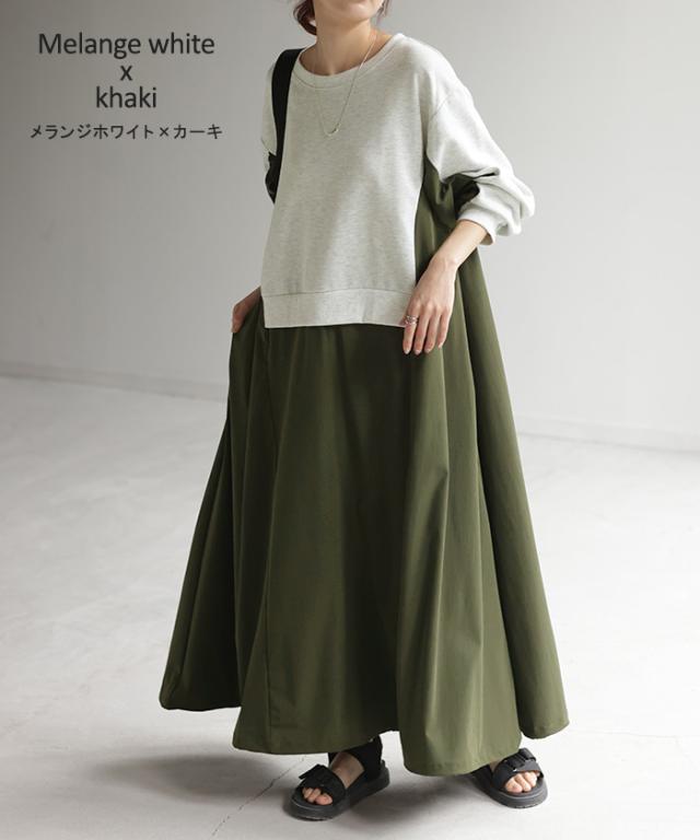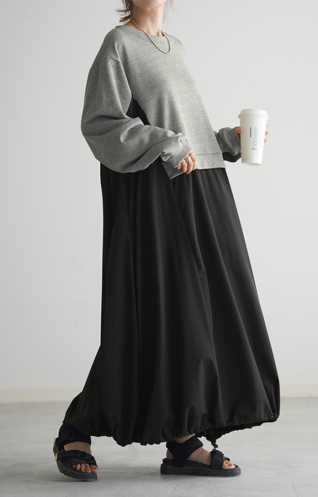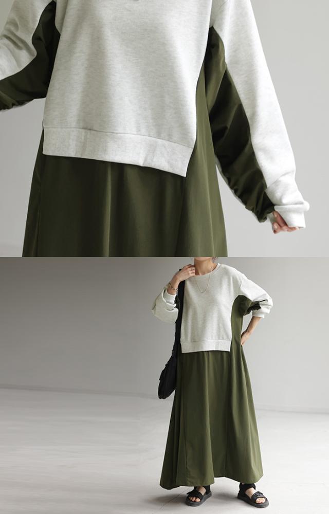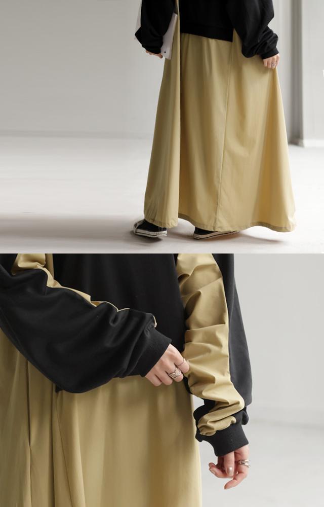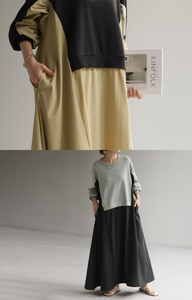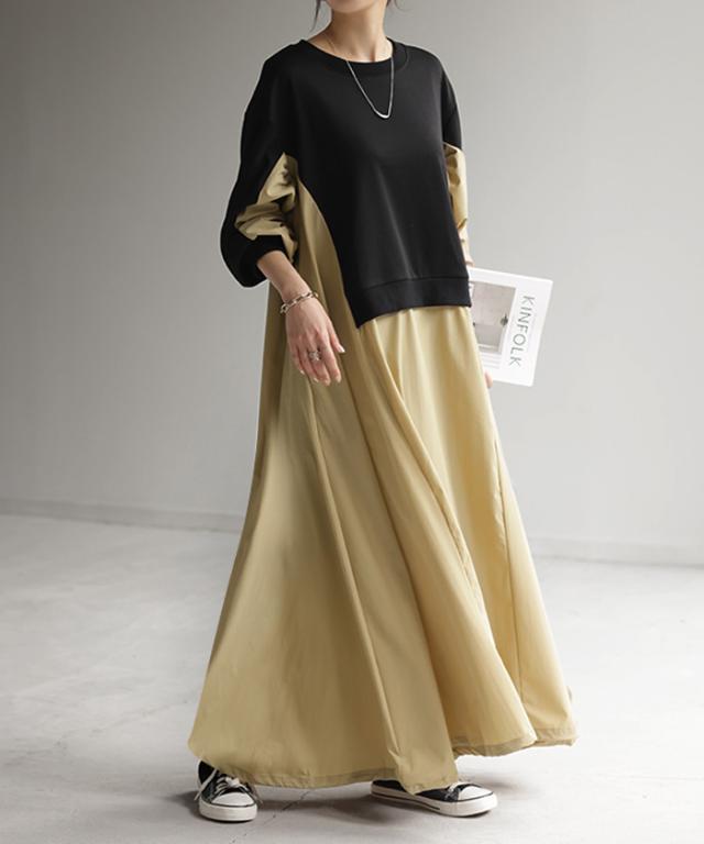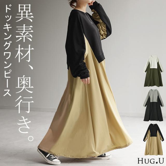 ワンピース ロング バイカラー レディース バイカラーワンピース ロングワンピース マキシ ナイロンワンピース ナイロン スウェット スエット スウェットワンピース 配色 長袖 体型カバー ゆったり モード 無地 大きいサイズ 黒 ベージュ 春 夏 HUG.U 秋新作
