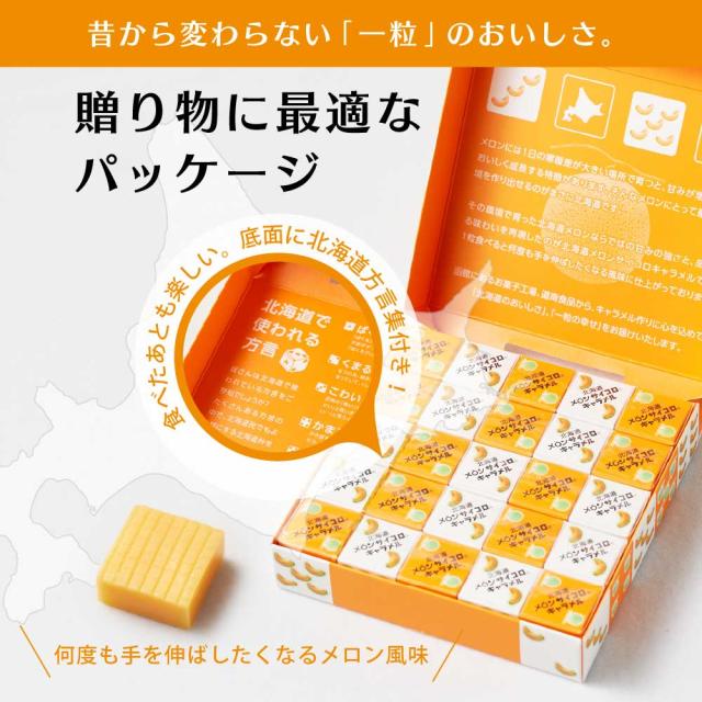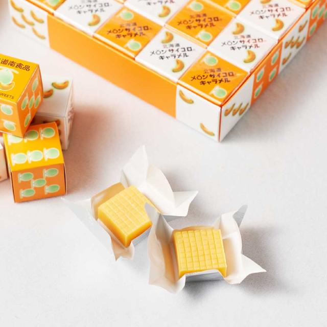 | 商品説明 | メロンをサイコロの目に見立てたサイコロキャラメルです。 北海道産メロンのパウダーを使用した香り豊かでジューシーな味わいに仕上げました。 これからもみなさまに長く愛され続けるようにもっとおいしく、もっと北海道らしい商品としてお届けしていきます。 |