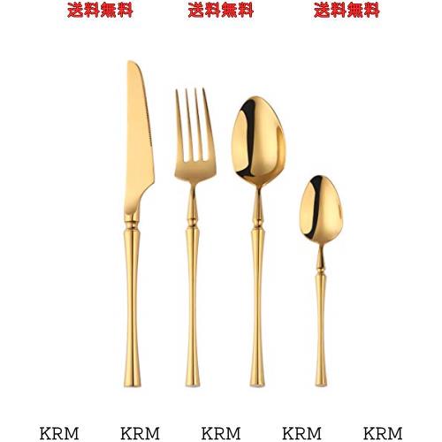 Buyer Star ステンレス カトラリーセット ゴールド ナイフ フォーク スプーン 4本セット 高級洋食器 北欧風 一体型ディナーセット 鏡面仕