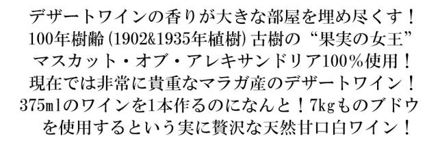 デザートワインの香りが大きな部屋を埋め尽くす! 100年樹齢(1902&1935年植樹)古樹の“果実の女王” マスカット・オブ・アレキサンドリア100%使用! 現在では非常に貴重なマラガ産のデザートワイン! 375mlのワインを1本作るのになんと!7kgものブドウ を使用するという実に贅沢な天然甘口白ワイン!