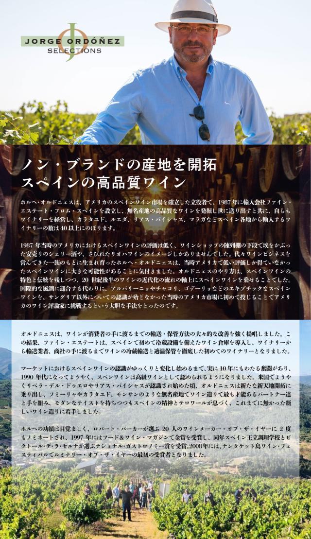■ぶどう品種:マスカット・オブ・アレキサンドリア種100%このワインは、マスカット・オブ・アレキサンドリア種100%の贅沢な天然甘口ワインである。 傾斜70度の山の斜面に位置する100年以上と85年以上の2つの古樹から手摘みで収穫された葡萄を使用し、房ごと圧搾して小型のステンレスタンクで発酵。発酵中にアルコール度数が10%に達した時点で発酵を止め、その後8ヶ月間シュールリー熟成させている。 このワインは、シロップのような贅沢な口当たりを持ちながら、鮮やかな酸が全体のバランスを引き締め、爽やかな甘みに仕上がっている。 375mlのワインを1本作るのに7kgものブドウが使われるという実に贅沢な天然甘口ワインで、干しブドウを感じる芳醇な厚みのある香りが特徴的だ。ワインスペクテーター誌で驚異の92点、ペニンガイド誌で96点を獲得するなど、極上のスペイン極甘口デザートワインと評されている。 |