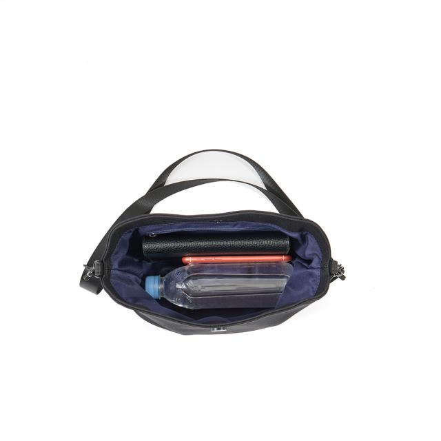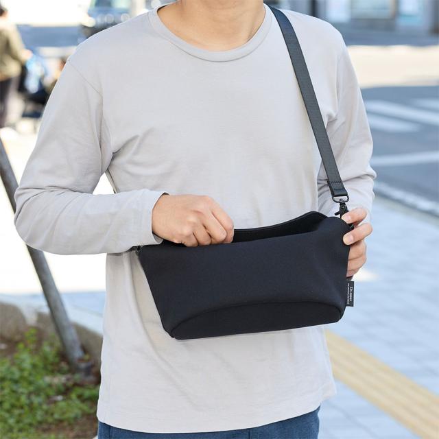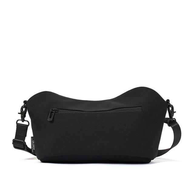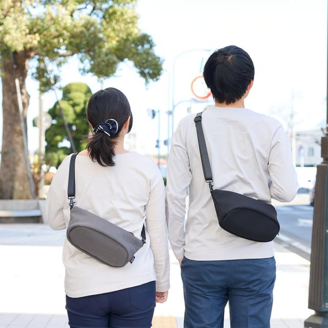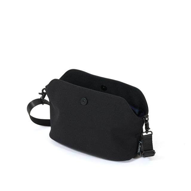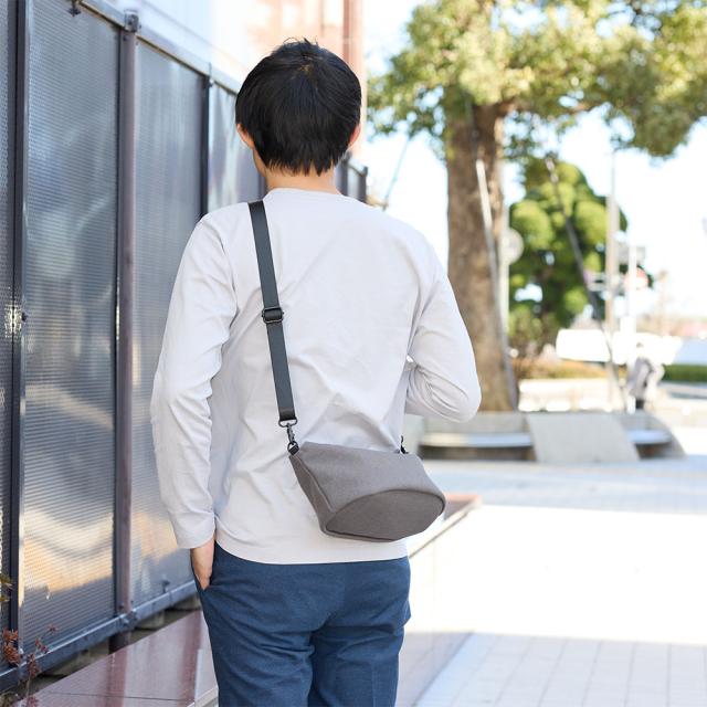 コンパクトなショルダーバッグで、ハーフフラップのデザインが特徴的。コンパクトながら500mlペットボトル・長財布が両方収納できるので、とても実用的です。背面にはファスナーポケットを配置しています。