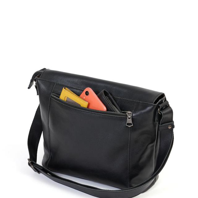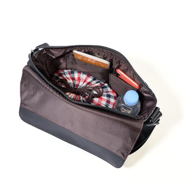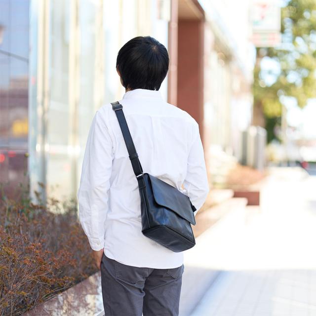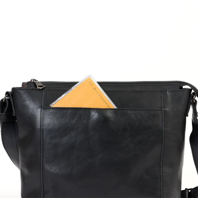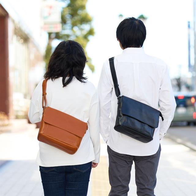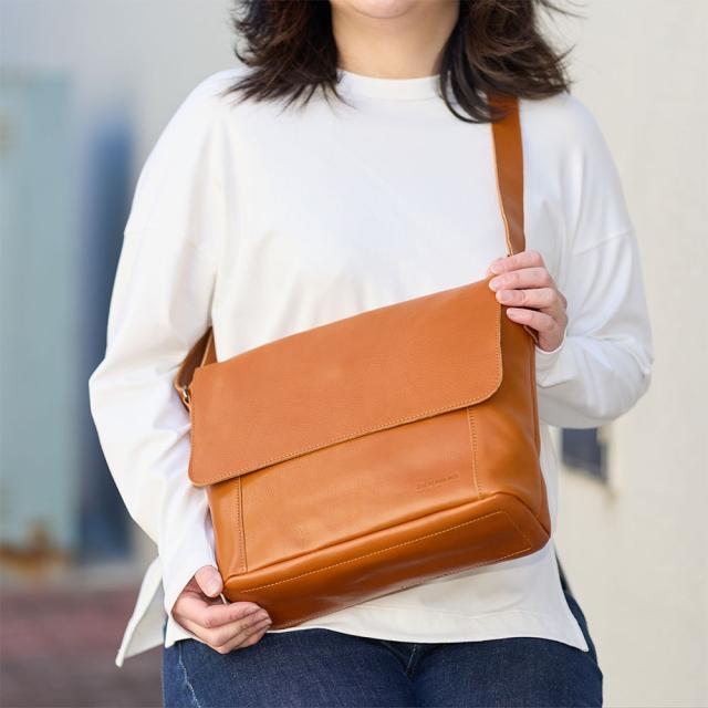 DOUBLESの本革ショルダーバッグ。シンプルで男女ともに使いやすいデザインがポイントで、オンオフ両方で使えます。メイン収納部は500mlサイズペットボトルを立てて収納できるサイズなので、旅行やお出かけにぴったり。正面のポケットにすぐに取り出したいものを収納すれば、メイン収納部を開くことなくアクセスできます。