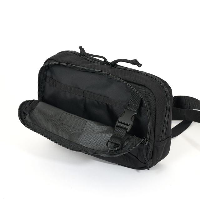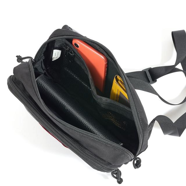 メイン収納部は長財布や500mlペットボトルが横向きに入るサイズ感。前面にはファスナーポケットがあり、中に小物ポケットも装備しているため、仕分けもバッチリ。荷物の少ない通勤や、プライベートでの使用にも適したアイテムです。