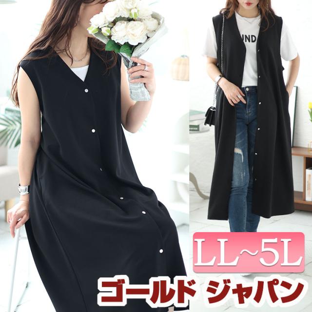 秋新作 大きいサイズ レディース ワンピース シルバーボタンVネックジャンパースカート ロングワンピース ロング ノースリーブ ジャンスカ ジャンパースカート Vネック ベスト ボタン ポケット ストレッチ 春服 夏服 秋服 冬服 LL 2L 3L 4L 5L ブラック 黒 ゴールドジャパン