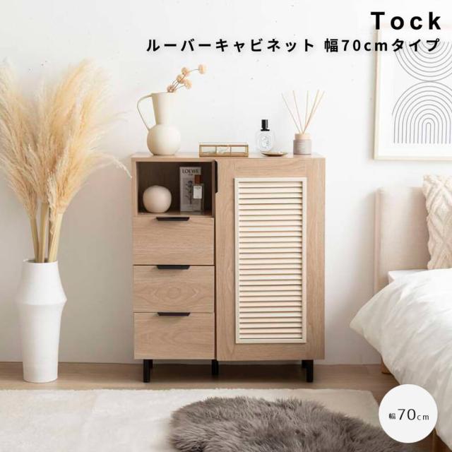 自然な木目が心地よい温かみを演出し、繊細なルーバーデザインが空間に優雅なアクセントを加える、使い勝手抜群のキャビネットTock(トック)。