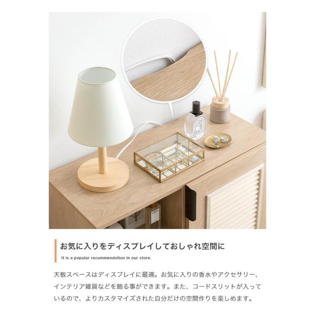 ナチュラルな木目と洗練されたルーバーデザインが特徴のキャビネットは、お部屋に上品な雰囲気をもたらす。