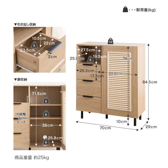 耐荷重: 天板 約10kg 、引き出し 各約5kg、オープン収納 約5kg、扉収納内可動棚 約6kg 、扉収納内底板 約6kg