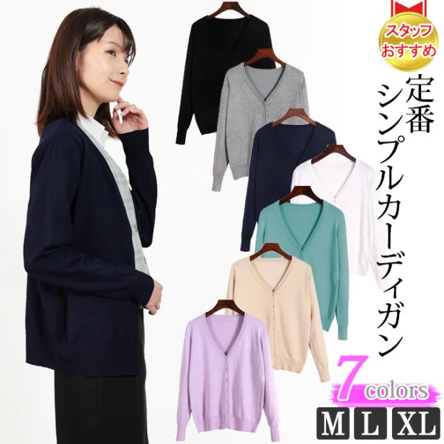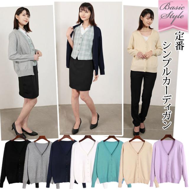 カーディガン レディース オフィス 制服 事務服 長袖 Vネック オフィスカジュアル 通勤 通学 仕事用 ニット シンプル 無地 白 黒 紺 伸縮性 カーデ 定番 シンプルきれいめ 春 夏 秋 冬 大きいサイズ