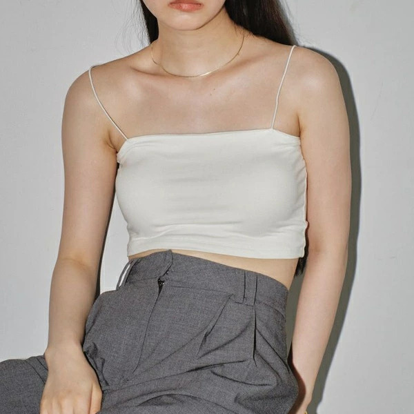 華奢なストラップと直線的なネックラインはヘルシーな印象に。