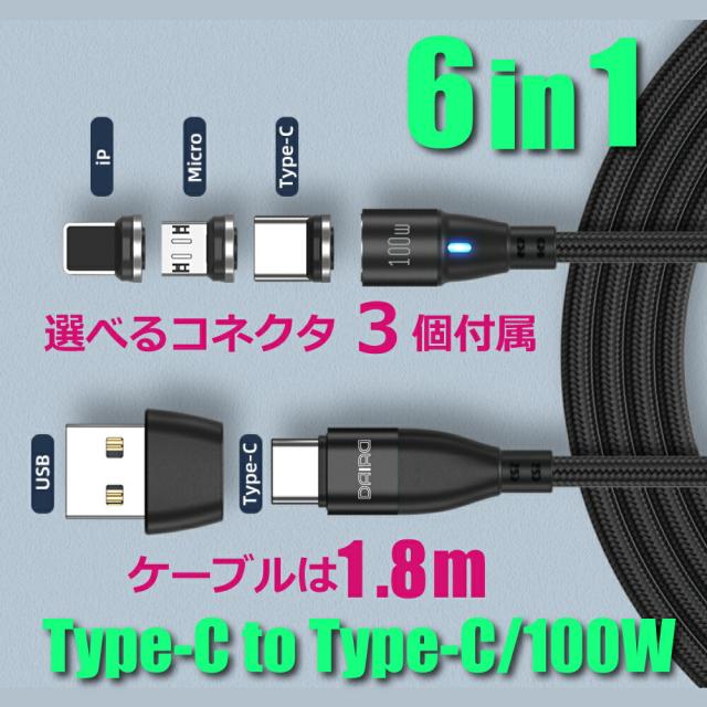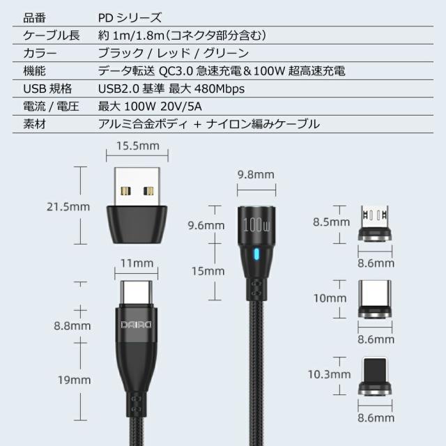 【全機種対応 選べる】DAIAD USB C Type-C PD 100W マグネット 充電ケーブル 3in1 ノートPC 高速 急速 スワップ充電 iPadPro MacBook データ転送 ChromeBook Galaxy Lightning MicroUSBC iPhone iPad LED 防塵 USB変換アダプター付き 1.8m 9PIN eMarker 5A 9ピン USB変換