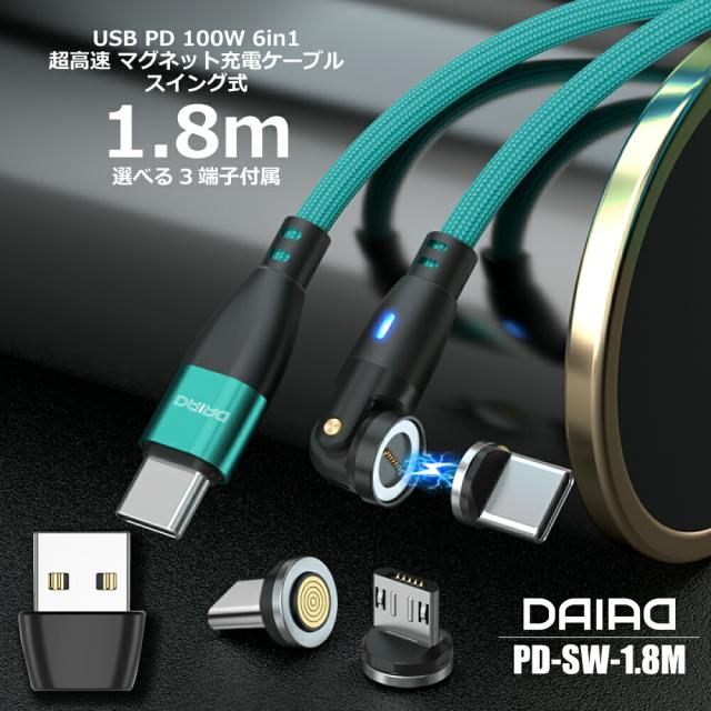 【全機種対応 3in1】DAIAD USB C Type-C PD 100W マグネット式 充電ケーブル 540度 高速 データ転送 急速 QC3.0 iPadPro ノートPC MacBook ChromeBook Galaxy MicroUSB Lightning iPhone iPad eMarker 5A 360度回転 防塵 LED 首振り 1.8m 9PIN 1.8m iPhone15 9ピン ナイロン