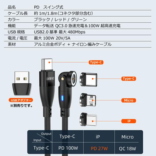 | 商品名 | 540度 マグネット充電ケーブル 9PIN PD 100W 端子3個 1.8m |