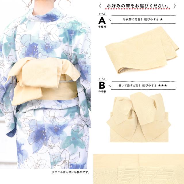 帯は、体に巻いて後ろで結ぶタイプの半幅帯、または作り帯からお選びいただけます。モデル着用は半幅帯です。
