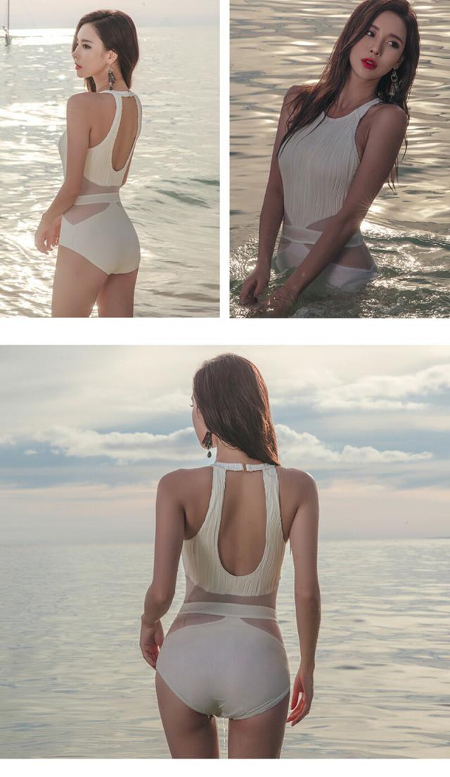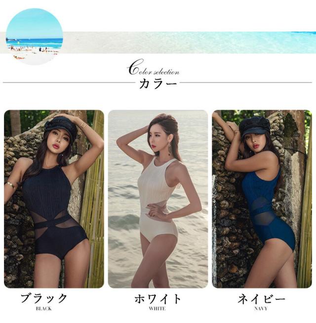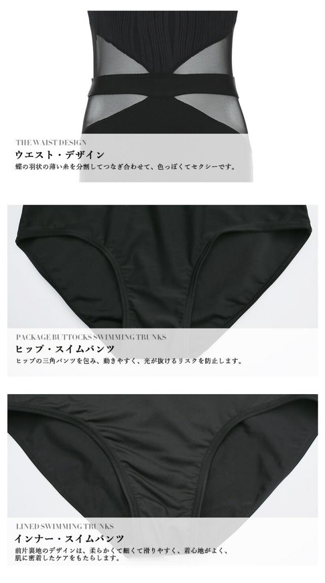 気になるお腹をカバーできる、女性には嬉しいワンピースタイプです。ウエスト部分を斜めに透けさせることで、細見え効果を発揮します。ショーツ部分はシンプルなので、脚長効果も期待できます。