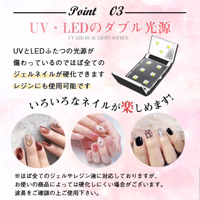(※ほぼ全てのジェルやレジン液に対応しておりますが、お使いの商品によっては硬化しにくい場合がございます。波長をご確認の上ご使用下さい。)