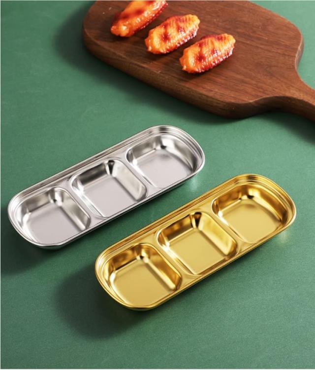 韓国食器ステンレス薬味皿仕切皿小皿,漬物、キムチ、涼菜、醤油調味料、スパイス、酢,2個入り (三区分皿(金+銀))